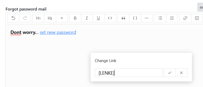 The correct value to insert in link is described under each field. Here, [LENKE] is replaced with the link to set a new password.