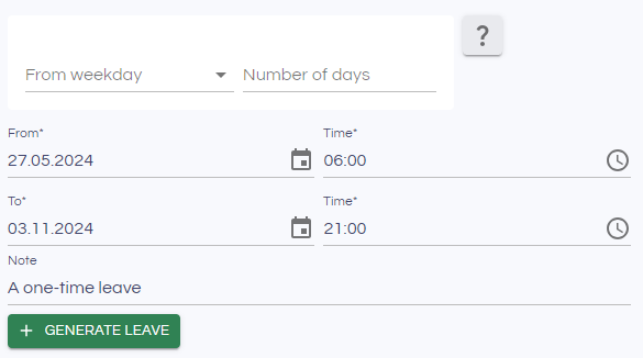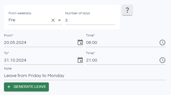 - You can create several leave lines per booking that repeat. Choose the day of the week and the number of days the leave should last. From and To date will then define how long a period leaves will be made for. If a time period of three weeks has been selected and the booking(s) should have a Leave every Friday for three days, you choose from Friday, three days and the period. Leaves will then be generated for the entire period and the booking will have leaves Friday-Monday in that period.