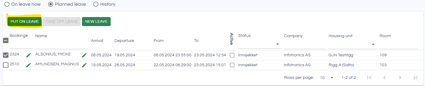Activating/putting a booking on leave is done from the Planned leave view. Putting bookings on leaves can only be done within the leave period.
