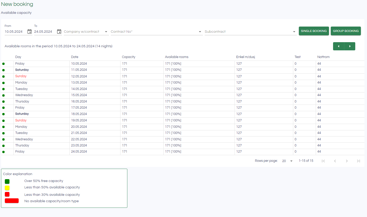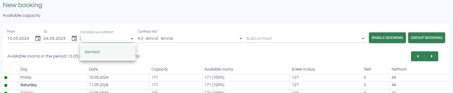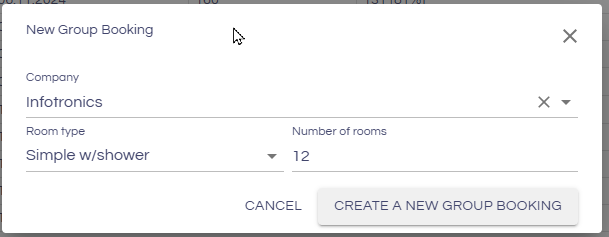 To create a group booking, click "Group booking". Select the company for which to create a group booking, and the type and number of rooms requested. The group booking will be created. A more detailed review of group bookings can be found here