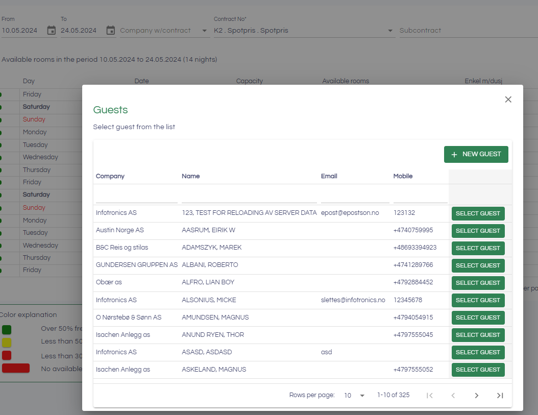 After you have clicked on "Single booking", a dialog will appear, where you can choose which guest should be added to the booking. There are several filters you can use: filter by name, company, email and phone number: