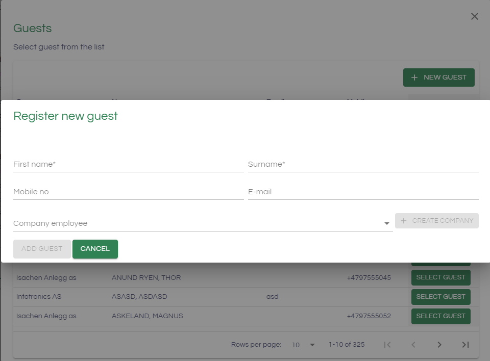 If you cannot find the guest, it is possible to create both a guest and a company. After creation, the guest will automatically be selected and the booking will be generated. To do this, press the "New Guest" button, which will open a form to create a new guest.