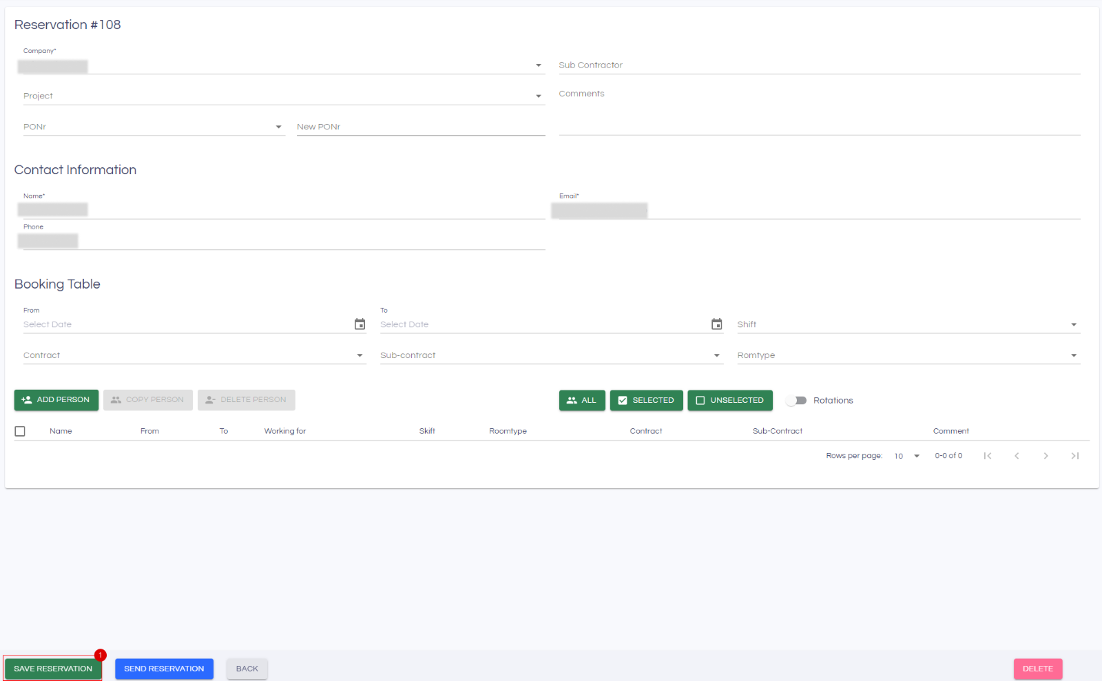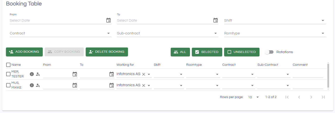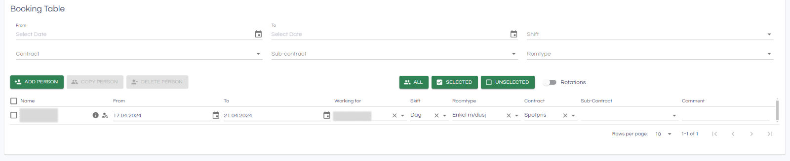 Selections and information under the Booking table header (From, To, Shift, contract, sub-contract and roomtype) are used as presets when adding a new person. This ensures efficient registrations of persons (only the guest must be added). Also, the presets can be used to bulk update persons already in the table: Enter the information to update (e.g. a new from date) and click the All, Selected or Unselected buttons to bulk update the corresponding rows in the booking table.