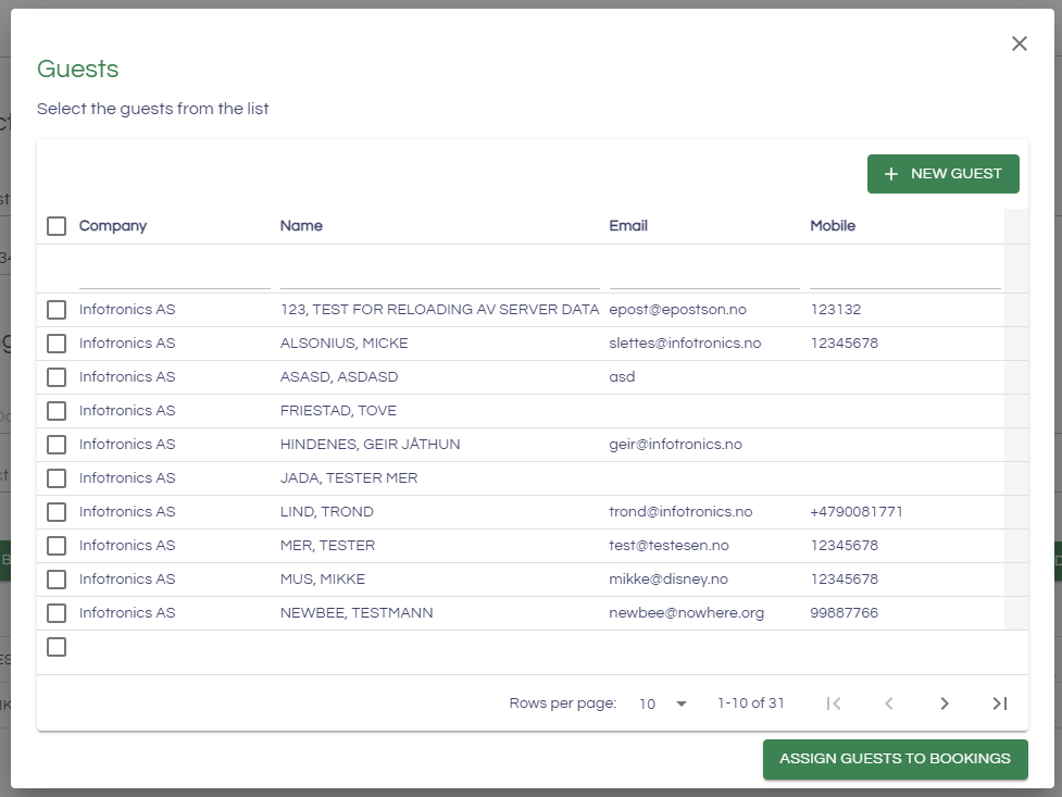 You will then get a form to fill out information on a new guest. You have to add an email first and last name and choose a company to add a new guest. The “Add guest button” (3) will turn green when all the required information is filled out. You then have to search for the new guest and choose it to add the person to the reservation.