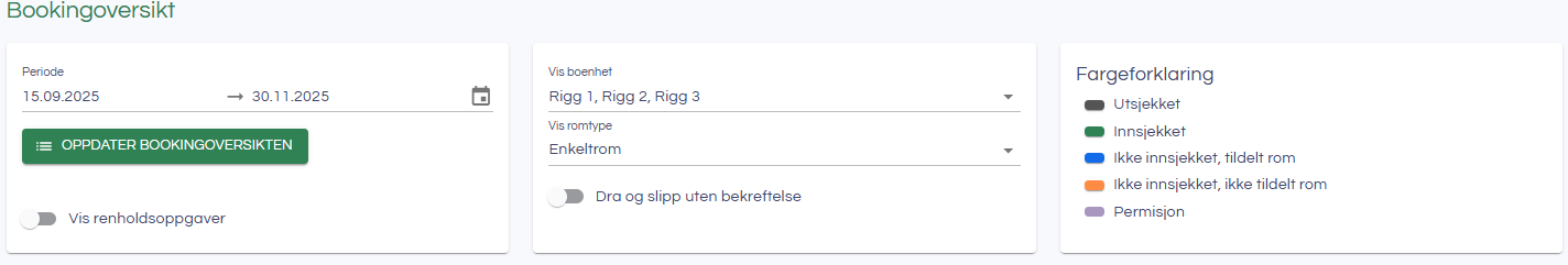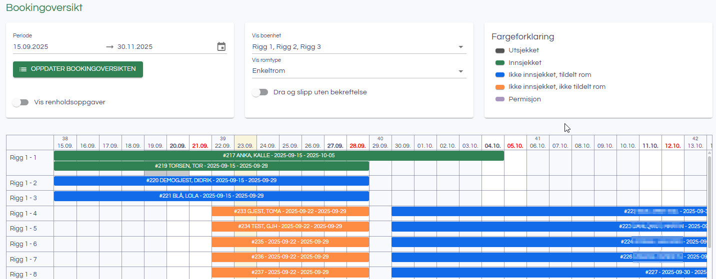 Under Administrasjon => Bookingoversikt finner man en interaktiv bookingoversikt.