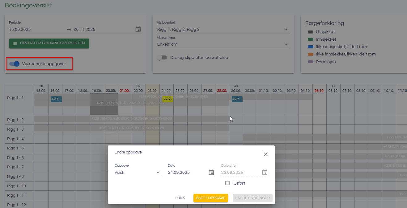 Ved å slå på bryteren Vis renholdsoppgaver vises planlagte oppgaver i oversikten. Når dette er valgt er det ikke mulig å endre bookinger, men ved å trykke på oppgaven kan man gjøre endringer på den som vist under.