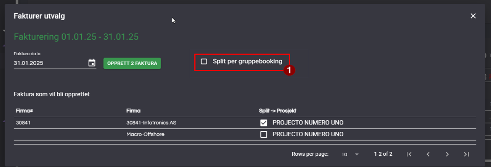 - Hvis det er slått på muligheten for å lage faktura pr gruppebooking vil man se valget Split pr gruppebooking (1) over. Hvis man krysser av i denne boksen vil det lages en faktura pr gruppebooking fra listen.