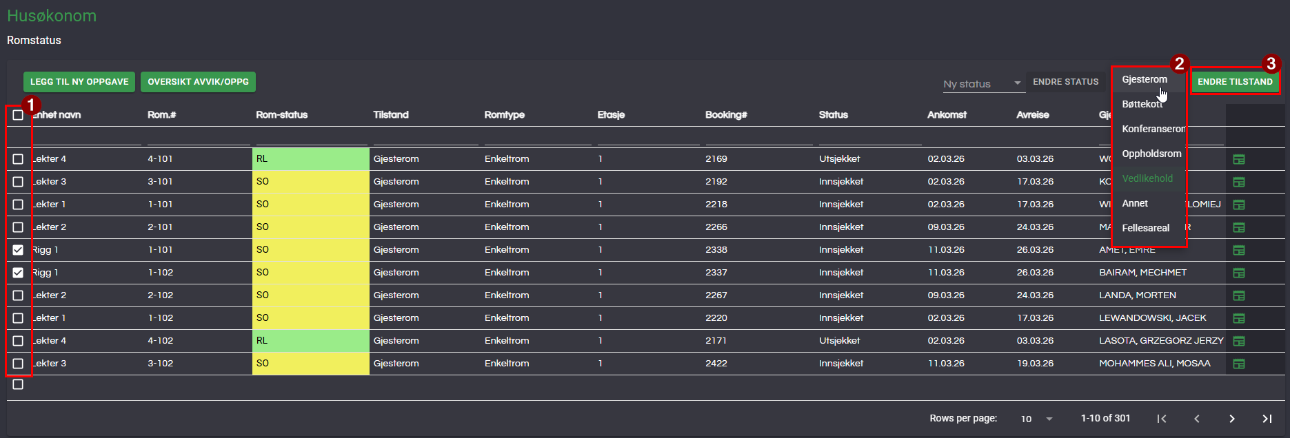 Under tildeling av bookinger til rom er det kun rom med tilstand Gjesterom som vises og kan tildeles til rom. Hvis et rom f.eks er under vedlikehold kan dette settes til Vedlikehold som vist under slik at ikke rommet er tilgjengelig.