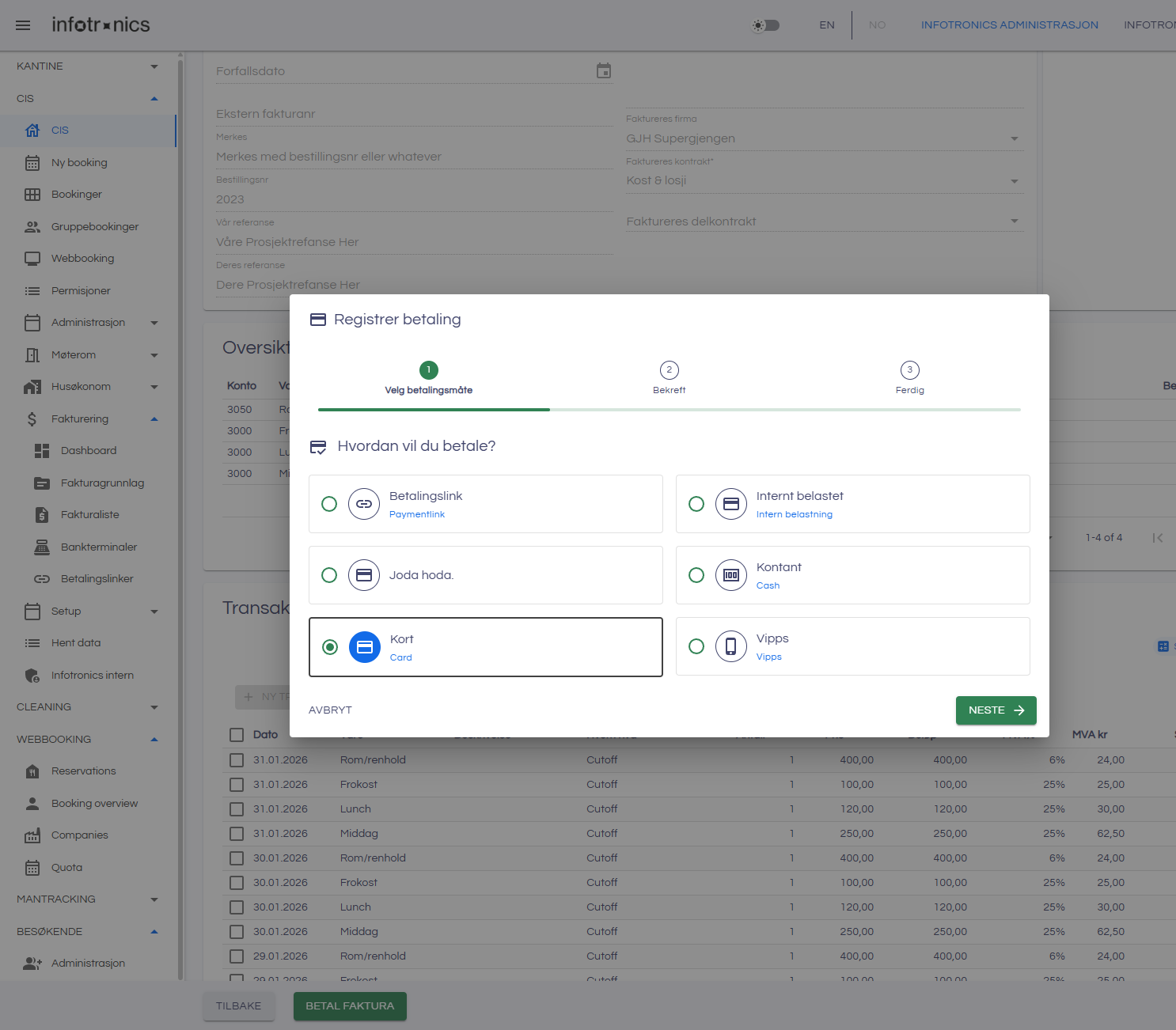 - Dialogen Registrer betaling åpnes og en kan velge ønsket betalingsmåte. Vi velger her kort